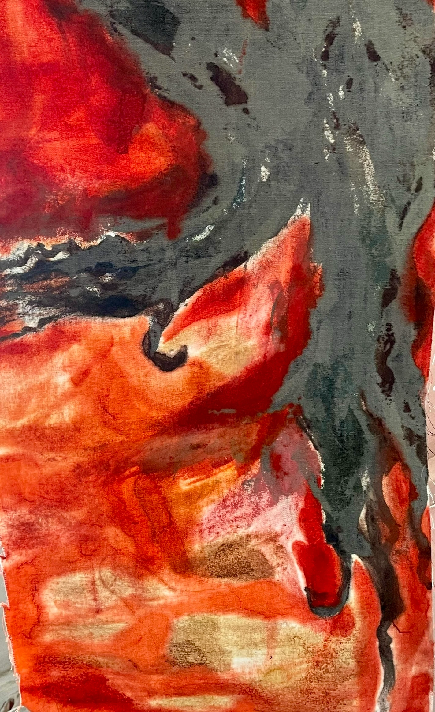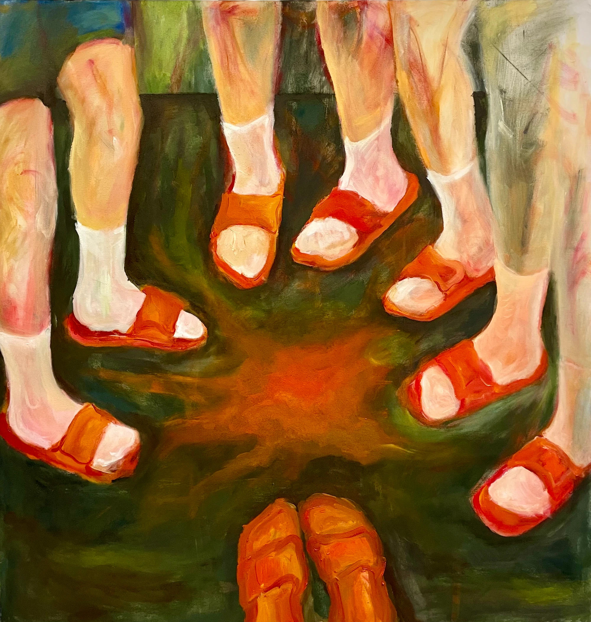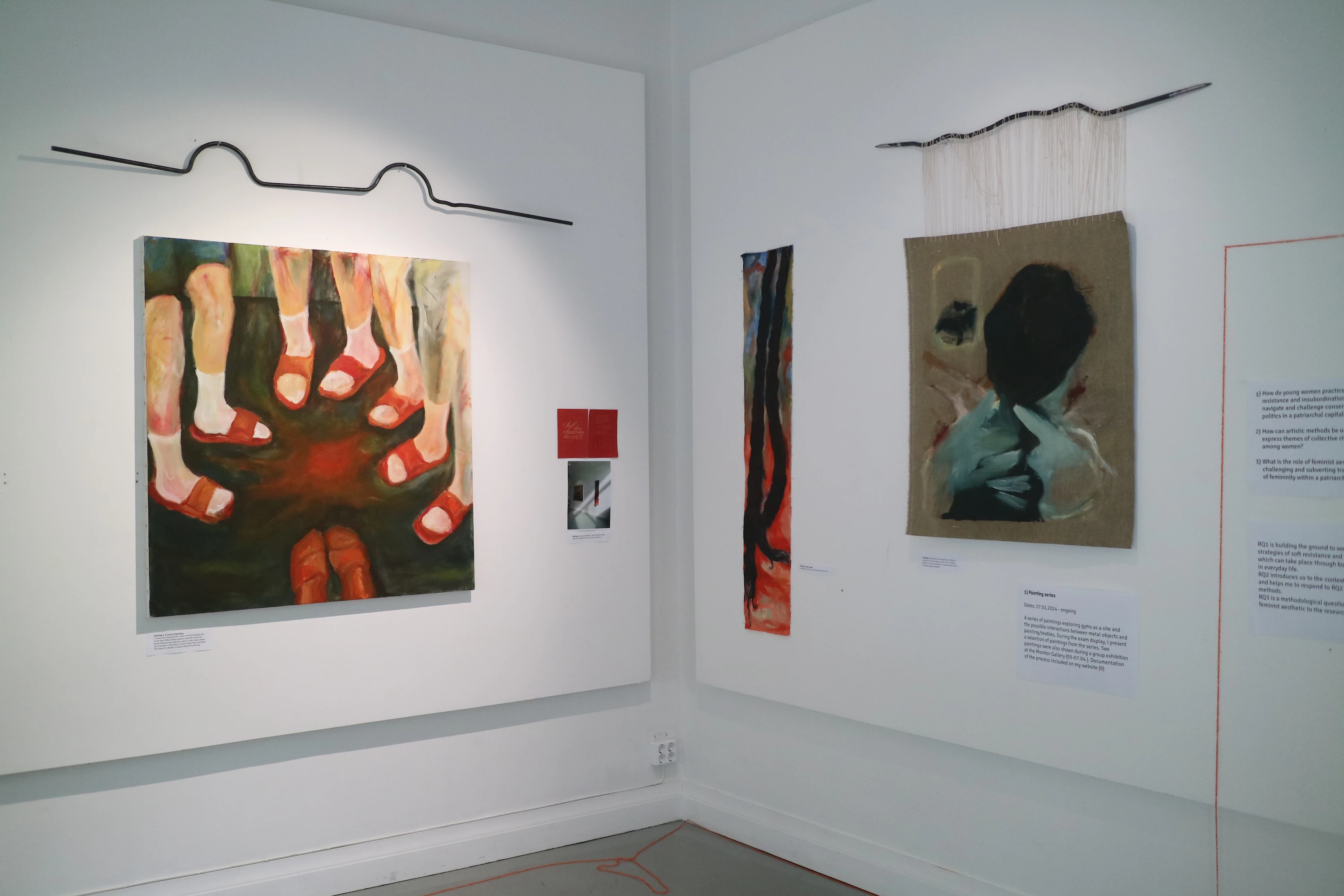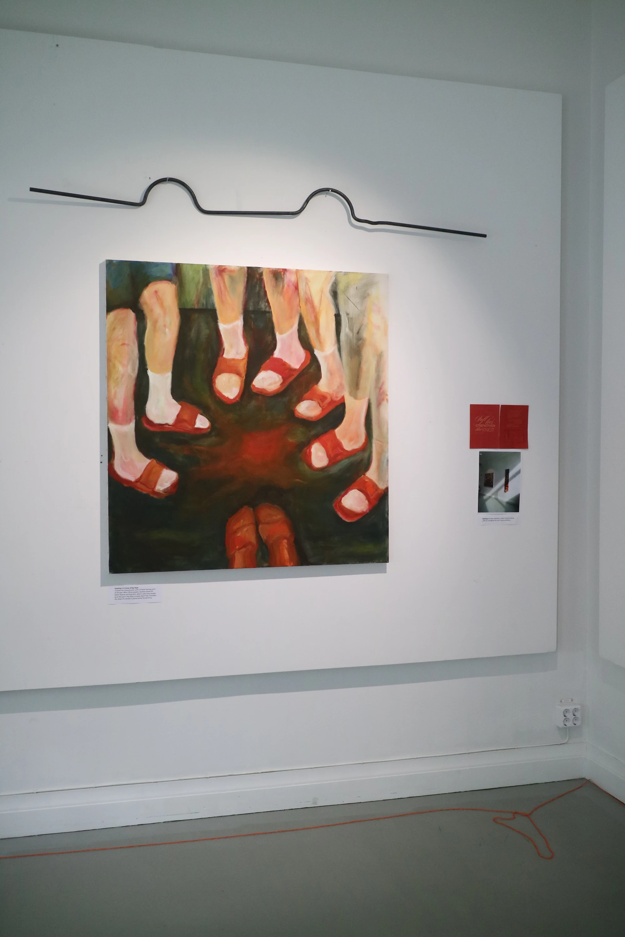 During the exhibition "Soft Ties Strengthen the Knot" (Gallery Monitor, Gothenburg), I presented two paintings created in response to themes of relationships, care, and community. The inspiration came from meetings of teenage girls at the gym, where they built relationships and a sense of agency through strength training. The paintings were made on canvas using oil paints and natural pigments, and their format and composition refer to bodily closeness and the materiality of shared space.