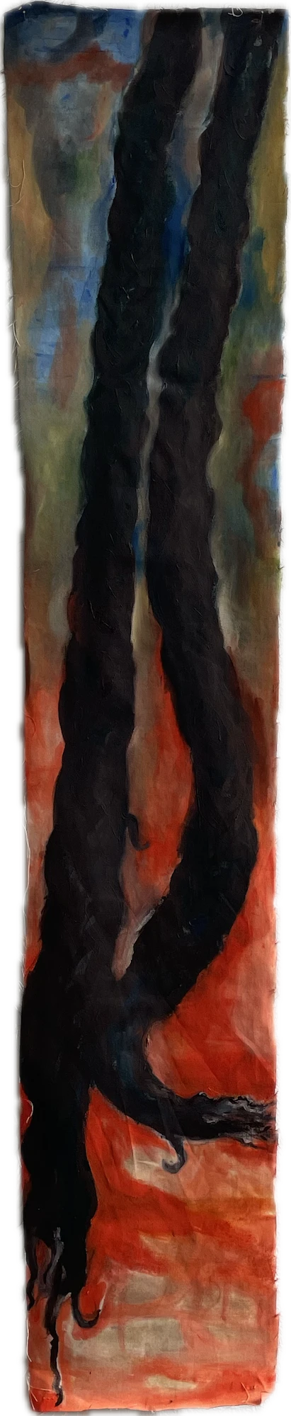 "Circle of Flip-Flops", oil on raw canvas, 2024, 140 × 140 cm, "Rope / Braid", oil on raw canvas, 2034, 100 × 20 cm.
